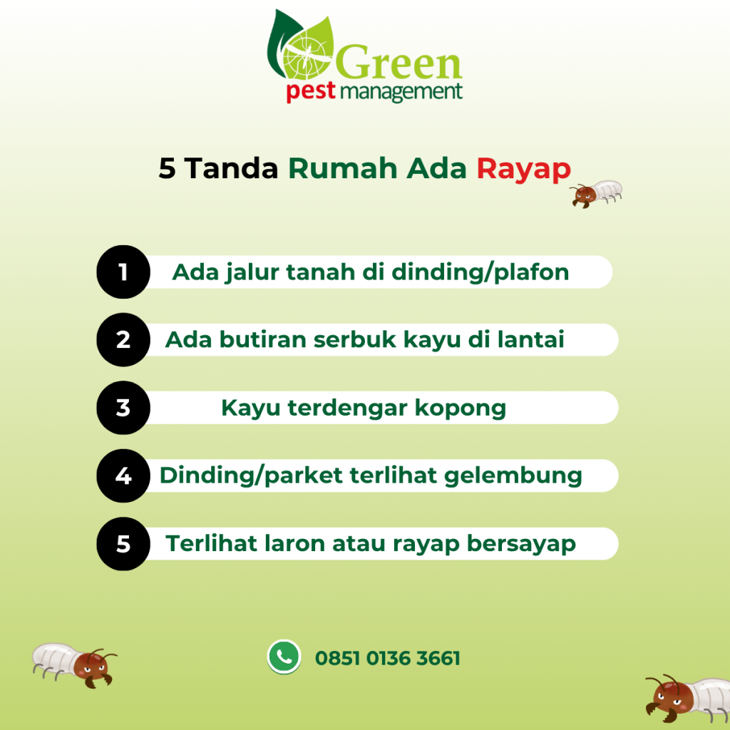 Rayap merupakan hama yang dapat menyebabkan kerusakan besar jika tidak segera ditangani. Mengenali ciri-ciri awal serangan rayap sangat penting untuk mencegah kerusakan yang lebih parah. Dengan perawatan dan pengendalian yang tepat, rumah dapat tetap aman dan nyaman untuk ditinggali.